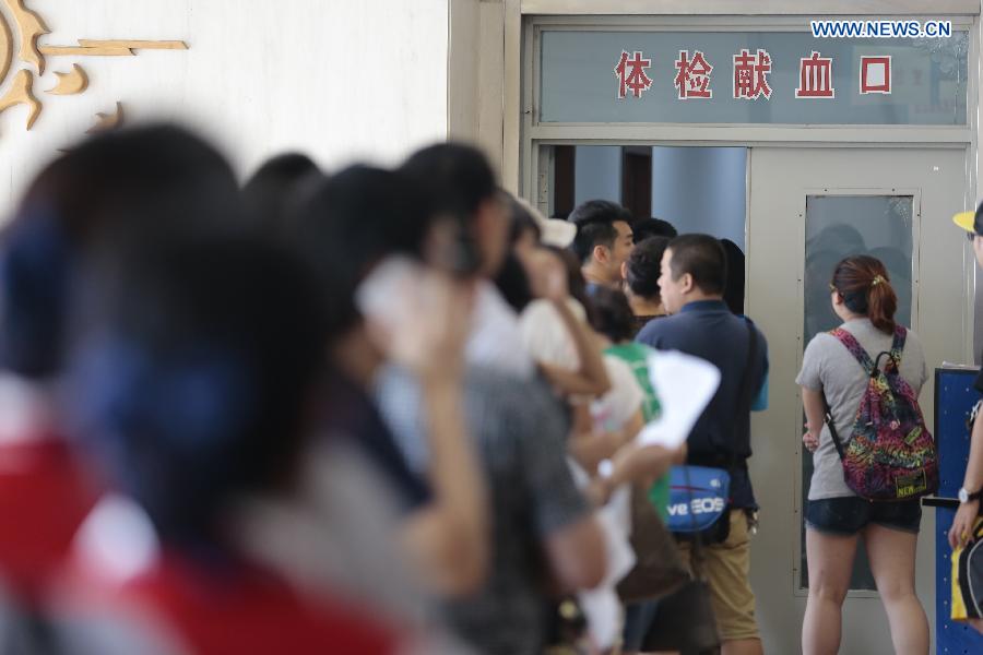 People queue to donate blood in Tianjin Blood Center in Tianjin, north China, Aug. 13, 2015. The death toll has climbed to 44 from two massive blasts that ripped through a warehouse in north China's port city of Tianjin as of Thursday noon, according to rescue headquarters. Twelve firefighters were among the dead. (Xinhua) |