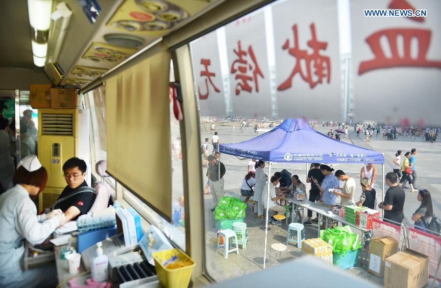People queue to donate blood outside a blood donation bus at Tianjin Railway Station in Tianjin, north China, Aug. 13, 2015. The death toll has climbed to 44 from two massive blasts that ripped through a warehouse in north China's port city of Tianjin as of Thursday noon, according to rescue headquarters. Twelve firefighters were among the dead. (Xinhua/Yang Baosen) |