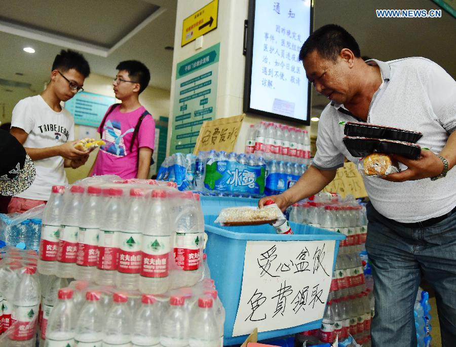 Volunteers set up a supply site at the hospital, providing free water and food in Tianjin, north China, Aug. 13, 2015. The death toll has climbed to 44 from two massive blasts that ripped through a warehouse in north China's port city of Tianjin as of Thursday noon, according to rescue headquarters. Twelve firefighters were among the dead. (Xinhua/Zhang Chenlin) |