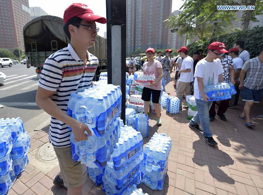 Volunteers carry water at the allocation site for people injured in the explosion of the Binhai new district in north China's Tianjin Municipality, Aug. 13, 2015. The death toll rose to 44, including 12 firefighters, from massive warehouse blasts in the northern Chinese port of Tianjin as firefighters continue to battle flames still blazing at the blast site. A total of 520 people have been hospitalized, including 66 critically injured, according to the rescue headquarters. (Xinhua/Yue Yuewei) |