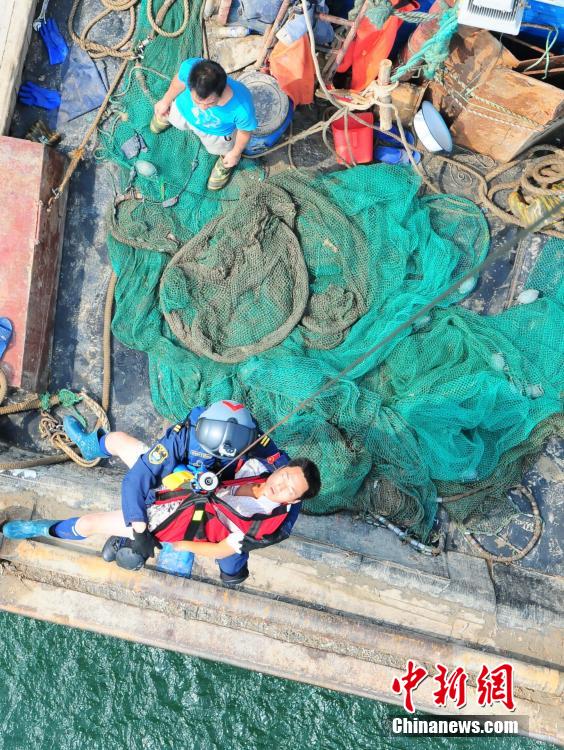 A fisherman was suddenly hit by breathing difficulty and fell into coma when fishing in the sea near Longkou, east China's Shandong province on Aug. 10, 2015. A rescue helicopter flied over 50 nautical miles to transport the fisherman to hospital. (Photo/CNS)