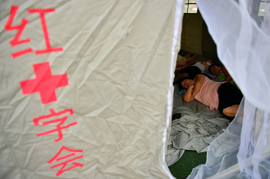 Nearby residents have a rest in the temporary tents in the No. 2 primary school of Tianjin Development Zone on Aug. 13, 2015. (Photo/Xinhua)