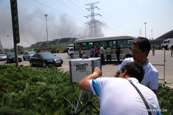 Staff members of Tianjin Environment Monitoring Center monitors air quality near the explosion site in Binhai New Area of Tianjin, north China, Aug. 13, 2015. The death toll has climbed to 44 from two massive blasts that ripped through a warehouse in north China's port city of Tianjin as of Thursday noon, according to rescue headquarters. Twelve firefighters were among the dead. (Xinhua/Jin Liwang) |