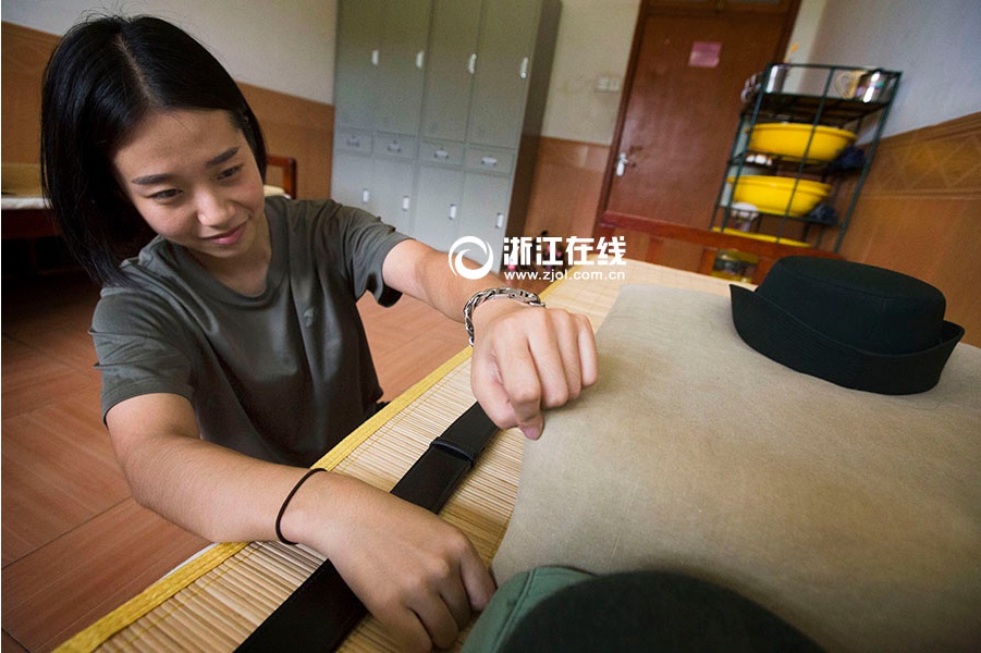 A soldier folds her quilt. (Zhejiang Online/Tong Xiaolei)