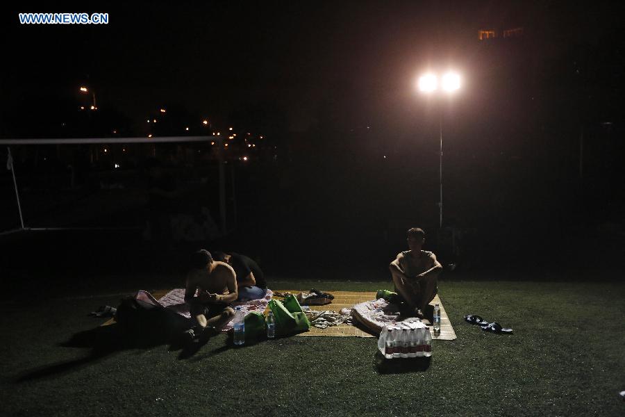 People rest at a temporary shelter in No. 2 Elementary School of the Binhai New District Development Zone in Tianjin, north China, Aug. 13, 2015. An explosion, which occurred Wednesday night at a warehouse in Binhai, has left 50 people dead and 701 others injured. (Xinhua/Shen Bohan) |