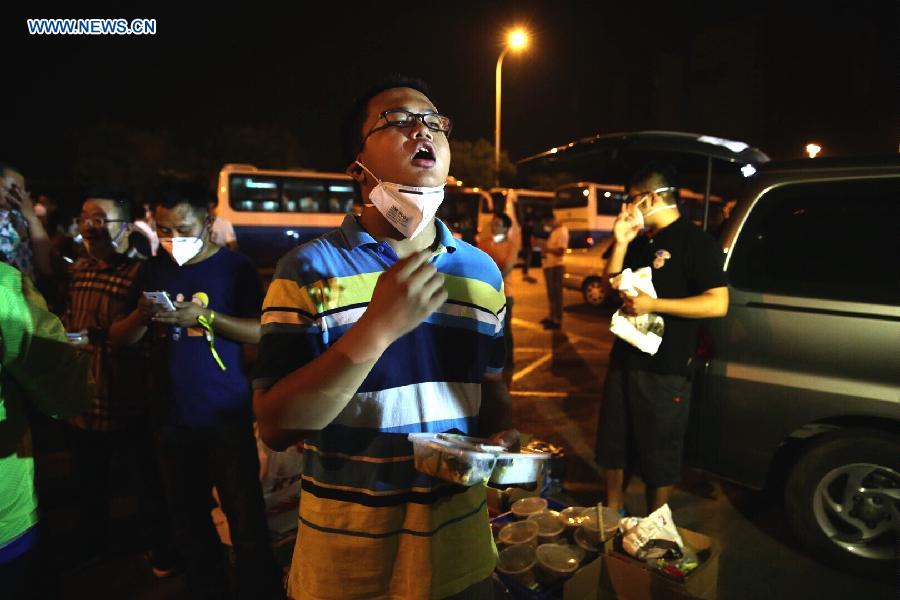 A volunteer distributes box meals to people living at a temporary shelter in No. 2 Elementary School of the Binhai New District Development Zone in Tianjin, north China, Aug. 13, 2015. An explosion, which occurred Wednesday night at a warehouse in Binhai, has left 50 people dead and 701 others injured. (Xinhua/Cai Yang) |