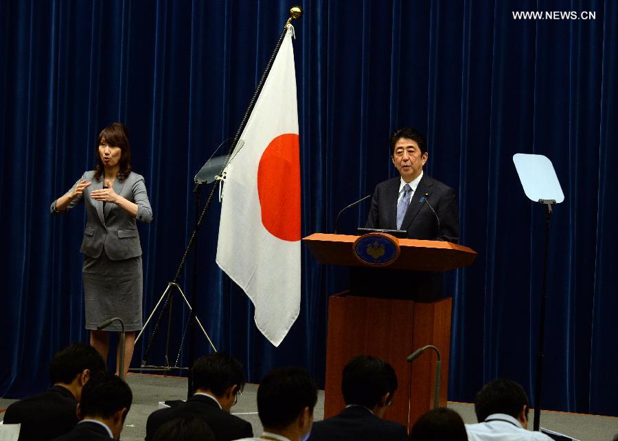 Japanese Prime Minister Shinzo Abe speaks during a news conference in Tokyo, Aug. 14, 2015. In a statement on Friday marking the 70th anniversary of the end of World War II, Abe mentioned previous governments' apology for Japan's wartime past, but refrained from offering his own apology. He also said that Japan must not let its future generations "be predestined to apologize." (Xinhua/Ma Ping)