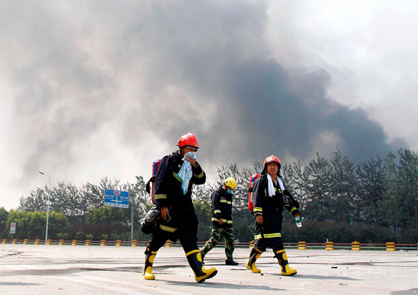 Firefighters return from the warehouse area, where they were involved in rescue operations.[ZHU XINGXIN/CHINA DAILY]