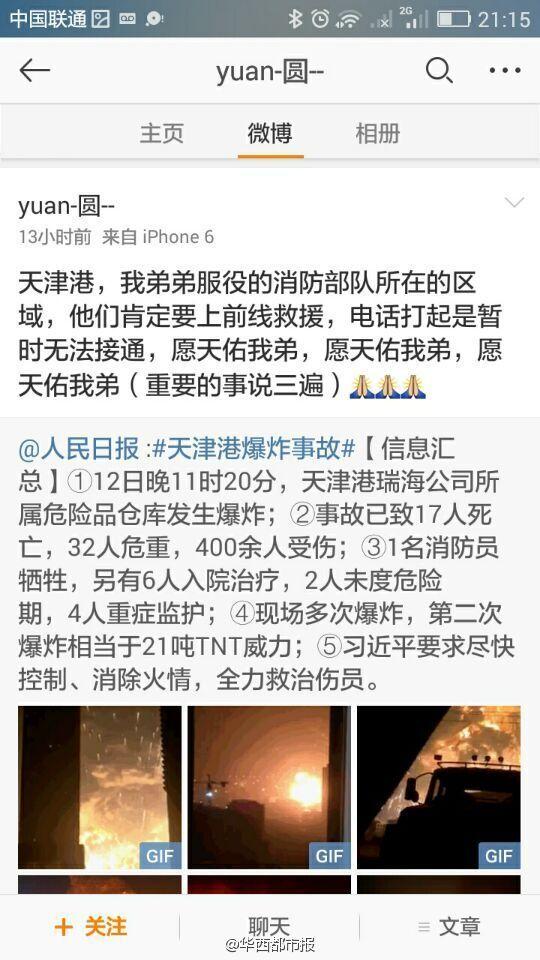 His sister prays for his safe return on Weibo after the blasts. (Photo from Weibo)