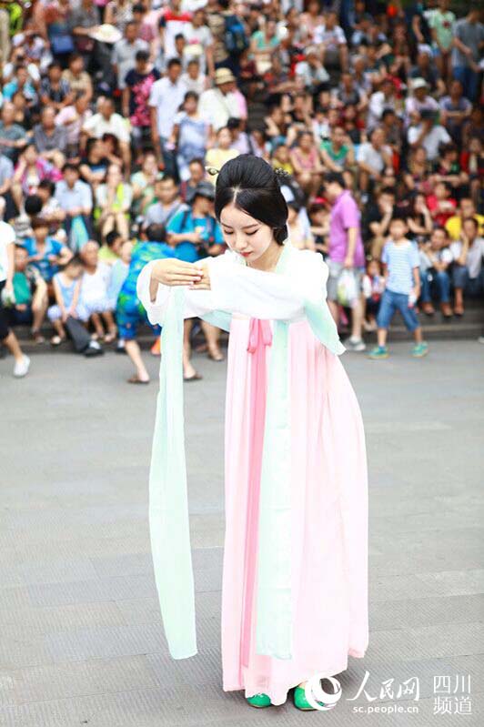 Chen Kebei, from Dujiangyan Campus of Sichuan Agriculture University, is dressed up in traditional Han Chinese costume in Libing Cultural Tourism Festival in Dujiangyuan. She has become an Internet hit for her elegant feature. (Photo/people.cn)