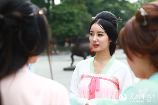 Chen Kebei, from Dujiangyan Campus of Sichuan Agriculture University, is dressed up in traditional Han Chinese costume in Libing Cultural Tourism Festival in Dujiangyuan. She has become an Internet hit for her elegant feature. (Photo/people.cn) |