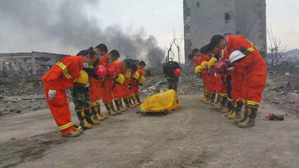Another missing firefighter was found dead at 5:38pm on Friday at the Tianjin blasts site. His comrades were saluting him while his body was being carried away.