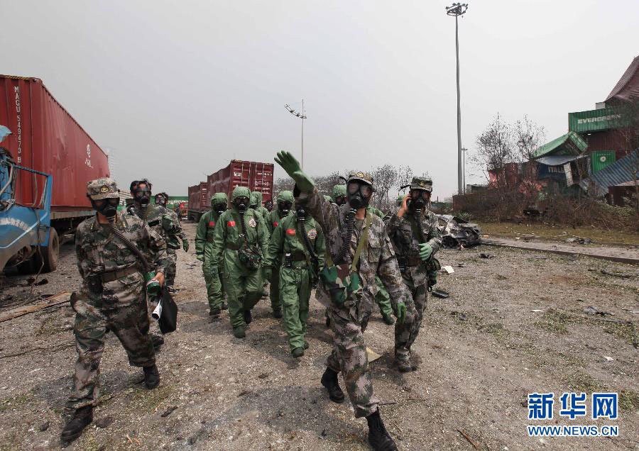 On Friday morning, officers and soldiers from the anti-chemical warfare corps of the Beijing Garrison Command were seen taking samples of the explosives at the Tianjin Blasts Site, according Military Online.