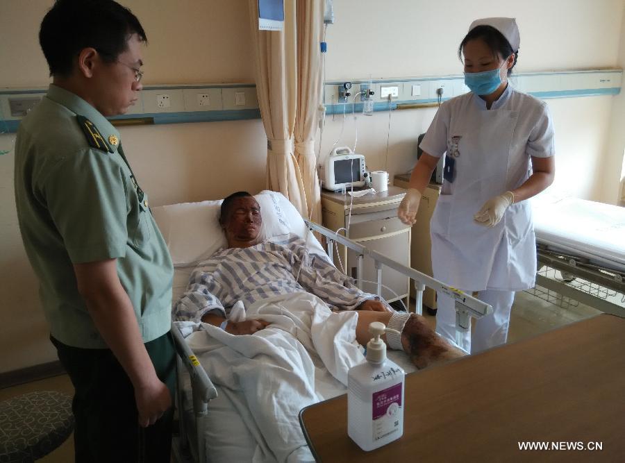 A nurse takes care of the rescued firefighter Zhou Ti in Taida Hospital in north China's Tianjin Municipality, Aug. 16, 2015. Zhou has recovered smoothly and can have slop for food on Sunday. (Xinhua/Lv Dong)