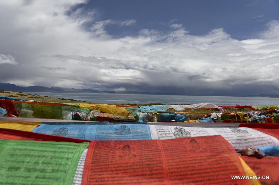 Photo taken on Aug. 7, 2015 shows prayer flags at the bank of the holy Lake Manasarovar in Zhada County of Ngari Prefecture, southwest China's Tibet Autonomous Region. (Xinhua/Liu Dongjun)