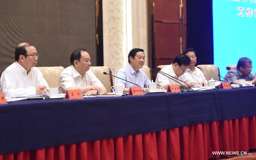 Liu Qibao (3rd L), head of the Publicity Department of the Communist Party of China (CPC) Central Committee, attends a symposium on the construction of rural spiritual civilization in Huzhou, east China's Zhejiang Province, Aug. 14, 2015. (Xinhua/Han Chuanhao) |