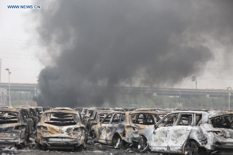 Damaged cars explose and trigger new blasts at the site of explosion in Tianjin, north China, Aug. 15, 2015. Death toll rose to 85 as of Friday night, including 21 firemen, from the massive warehouse explosions hitting north China's Tianjin City Wednesday night, the rescue headquarters said Saturday. Meanwhile, 721 others were hospitalized, including 25 critically wounded and 33 in serious condition. (Xinhua/Jin Liwang) |