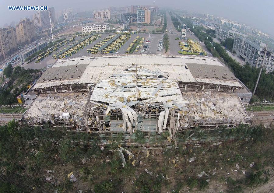 Photo taken on Aug. 15, 2015 shows a damaged building of Donghai Road Station of Jinbin Light Railine Tianjin, north China. Death toll rose to 85 as of Friday night, including 21 firemen, from the massive warehouse explosions hitting north China's Tianjin City Wednesday night, the rescue headquarters said Saturday. Meanwhile, 721 others were hospitalized, including 25 critically wounded and 33 in serious condition. (Xinhua/Yue Yuewei)