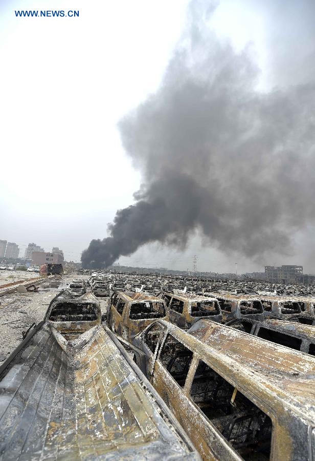 Damaged cars explose and trigger new blasts at the site of explosion in Tianjin, north China, Aug. 15, 2015. Death toll rose to 85 as of Friday night, including 21 firemen, from the massive warehouse explosions hitting north China's Tianjin City Wednesday night, the rescue headquarters said Saturday. Meanwhile, 721 others were hospitalized, including 25 critically wounded and 33 in serious condition. (Xinhua/Yue Yuewei)