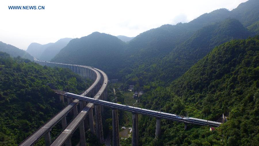 An aerial photo taken on Aug. 14, 2015 shows a high-speed train running out of a mountain tunnel as it runs on the Yichang-Wanzhou High-speed Railroad, which is built on a viaduct, in Enshi, central China's Hubei Province. The 377-kilometer-long Yichang-Wanzhou Railroad, which is regarded as the most difficult railroad ever built in China, winds through mountainous areas from its eastern station Yichang in Hubei Province to western station Wanzhou in southwest China's Chongqing. (Xinhua)