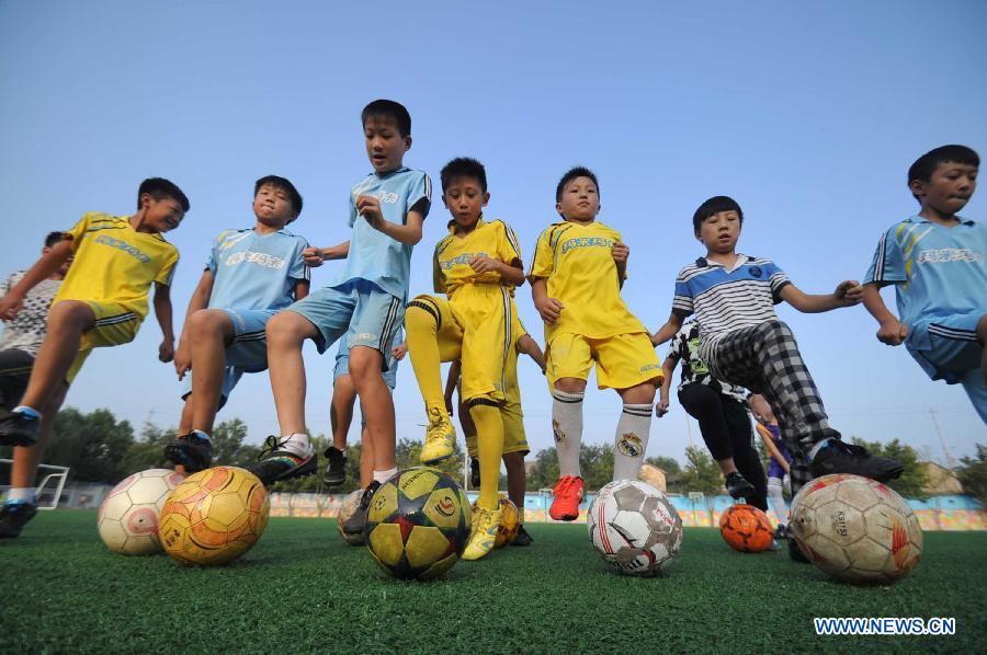 Members of a soccer team of Xijie Experimental Elementary School receive training in Xinjiang County of Yuncheng City, north China's Shanxi Province, Aug. 14, 2015. (Xinhua/Gao Xinsheng)