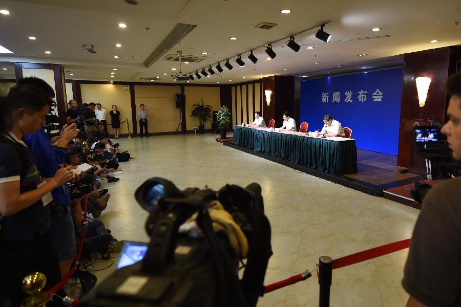 A press conference is held to notify the Tianjin explosion event in Tianjin, north China, Aug. 15, 2015. Gao Huaiyou, vice head of the Tianjin bureau of work safety, said that chemicals stored in the warehouse possibly include sodium cyanide, but further confirmation is needed. The containers were not open, and some were not even registered. Some local media reported earlier that Rui Hai Logistics, owner of the warehouse, had as much as 700 tonnes of sodium cyanide, but Gao said it was not yet verified. Measures have been taken to prevent secondary disasters, such as inviting sodium cyanide producers to help at the site, using hydrogen peroxide to reduce the amount of sodium cyanide, sending a taskforce to locate and measure the contaminated area and prevent its spread in sewage. Some other dangerous chemicals likely to be stored include potassium nitrate and ammonium nitrate. (Xinhua/Zhang Chenlin) |