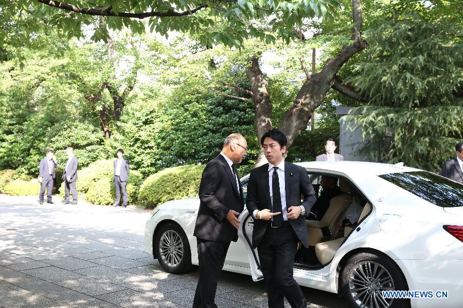 Shinjiro Koizumi (R), son of former prime minister Junichiro Koizumi, visits the Yasukuni Shrine in Tokyo, Japan, Aug. 15, 2015. Japanese Prime Minister Shinzo Abe on Saturday sent a ritual offering to the war-linked Yasukuni Shrine in Tokyo where two female cabinet members visited on the 70th anniversary of Japan's surrender in World War II. Around 100 conservative lawmakers, including LDP's policy chief, Tomomi Inada, former chairman of the National Public Safety Commission, Keiji Furuya and Shinjiro Koizumi, son of former Prime Minister Junichiro Koizumi, also visited the shrine. (Xinhua/Liu Tian) |