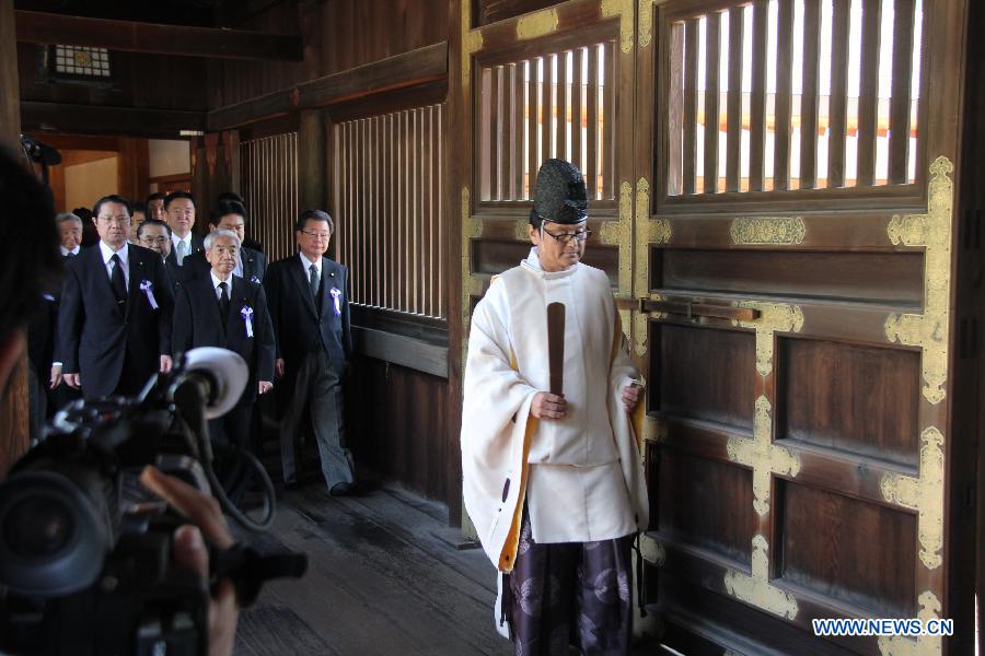 Japanese lawmakers visit the Yasukuni Shrine in Tokyo, Japan, Aug. 15, 2015. Japanese Prime Minister Shinzo Abe on Saturday sent a ritual offering to the war-linked Yasukuni Shrine in Tokyo where two female cabinet members visited on the 70th anniversary of Japan's surrender in World War II. Around 100 conservative lawmakers, including LDP's policy chief, Tomomi Inada, former chairman of the National Public Safety Commission, Keiji Furuya and Shinjiro Koizumi, son of former Prime Minister Junichiro Koizumi, also visited the shrine. (Xinhua/Lan Jianzhong) |