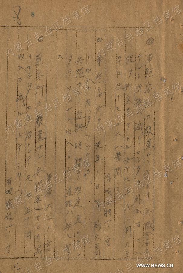 BEIJING, Aug. 16 -- A series of historical reports and personal letters, published by China's State Archives Administration on Sunday, has presented new evidence about the Imperial Japanese Army's war crimes in enslavement of "comfort women."