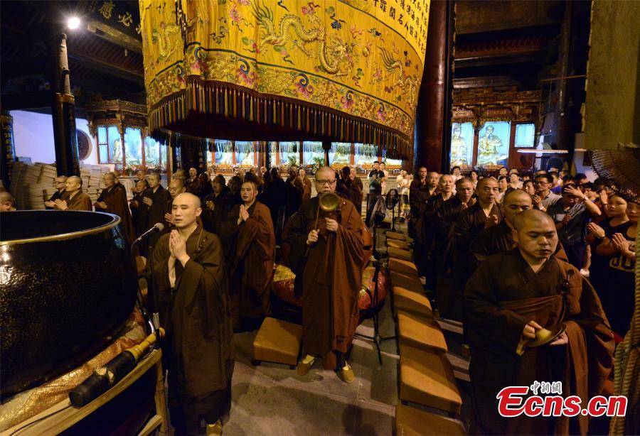 Monks pray for the victims of the Tianjin explosions at Mount Putuo in East China’s Zhejiang province, Aug 15, 2015. More than 1,000 monks attended the prayer service at Mount Putuo, one of the four sacred mountains in Chinese Buddhism. (Photo: China News Service/Chang Qi)