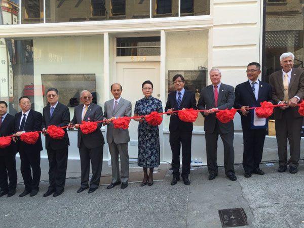 Florence Fang (center), curator of the WWII Pacific War Memorial Hall, and guests cut the ribbon at the opening ceremony of the memorial hall in San Francisco on Aug 15, 2015. LIA ZHU / CHINA DAILY
