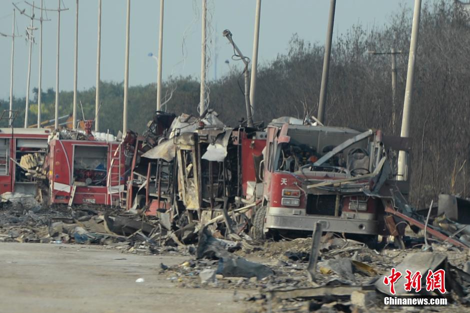 The photo taken on Aug. 16, 2015 shows the charred remains of police cars and fire engines at the center of the explosion site in Tianjin, north China. A total of 112 bodies have been found, and 95 people remained missing, including 85 firefighters, after massive warehouse explosions rocked north China's Tianjin city Wednesday night, officials said at a press conference Sunday morning.