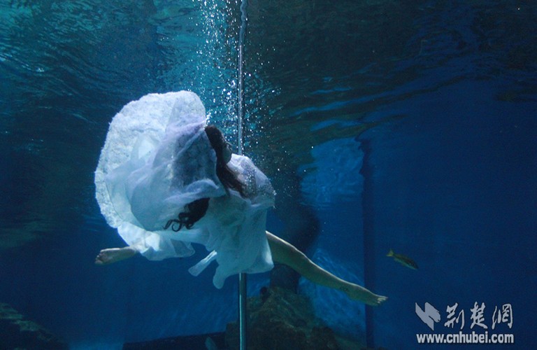 An underwater pole dance show is held at Wuhan Polar Ocean World, Aug. 14, 2015. The performer was Zhang Mingli, who is a polar dance instructor. She said it is much harder to perform pole dance under water since the pressure was difficult to control. (Photo/Cnhubei.com)