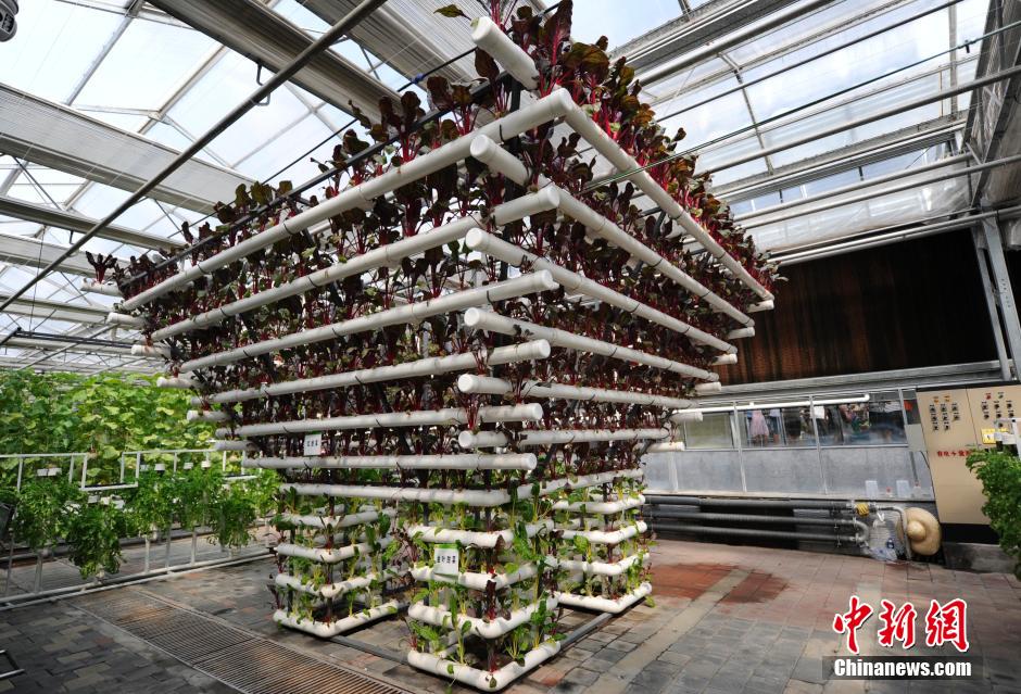 On Aug. 17, a structure of China pavilion made by the red sugar beet and gold leaf beet and other soilless cultivation of plants attracts people’s attention. (Xinhua / Zhang Yao)