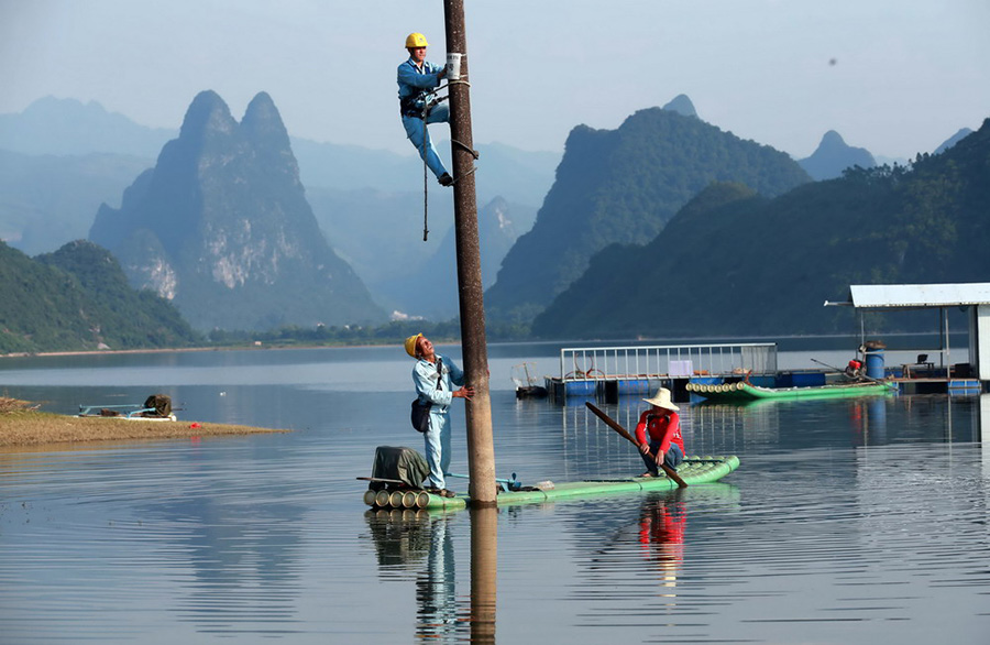 They repairs line in a water reservoirs, on Aug. 12. (Xinhua / Liu Jiaoqing)