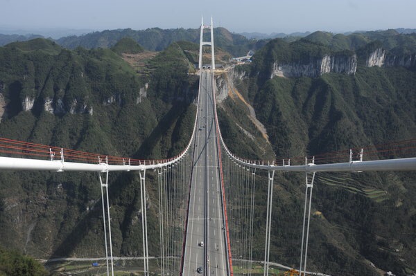 Aizhai Great Suspension Bridge, located in the town of Aizhai in Hunan province. Aizhai Suspension Bridge is about 20 km from Jishou city. It is crossing the surrounding valley near the Aizhai town, and Dehang river flows under the bridge. The difference between bridge deck designed elevation and ground elevation is 330 meters, total length of 1073.65 m, with the suspension bridge main span at 1176 m. The bridge that crosses the Aizhai Grand Canyon is the third highest mainspan in the world, and the first in Asia. The bridge is colored red, with 1,888 lights to increase visibility at night. |