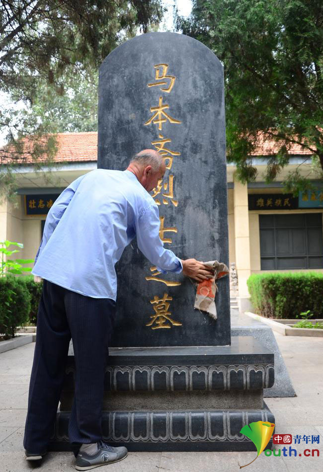 Cai wipes the tomb of the hero Ma Benzhai. (Photo/Youth.cn)