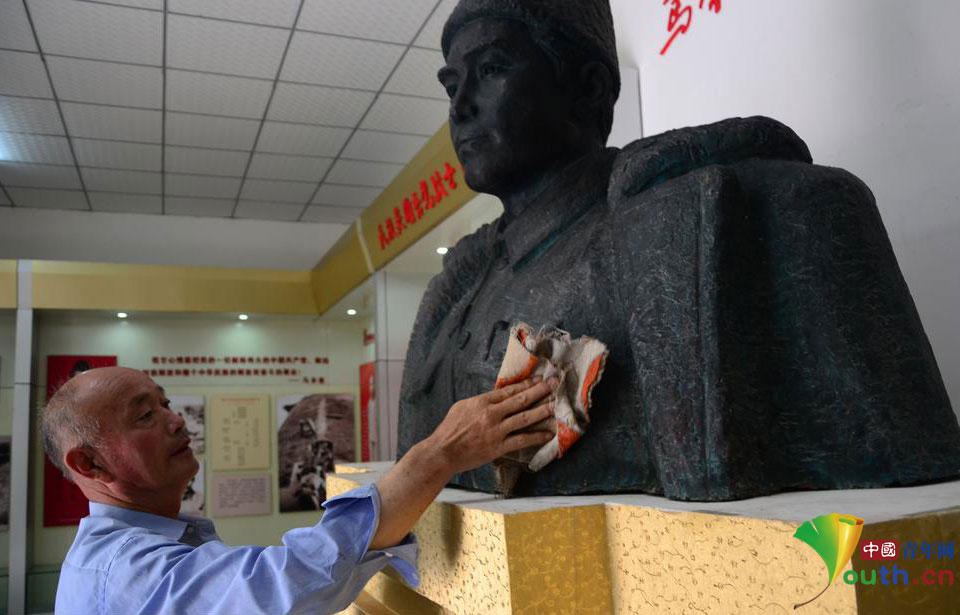 Cai wipes the statue of Ma Benzhai several times a day. (Photo/Youth.cn)