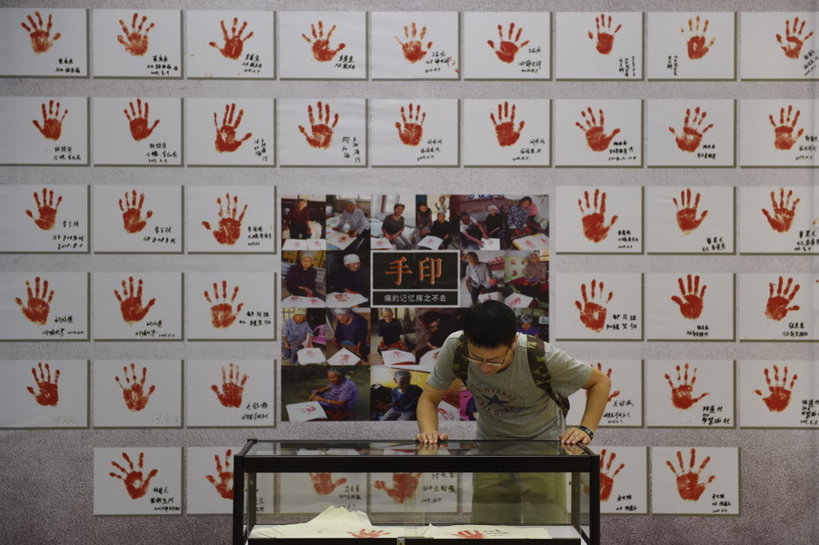 Visitors look at comfort women's hand prints, Aug. 18, 2015. (Photo/Xinhua)