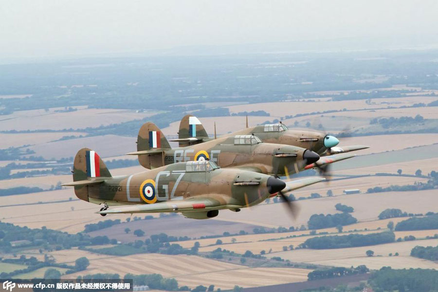 18 spitfires and 6 Hawker Hurricanes perform air show in southeastern England to commemorate the 75th anniversary of the Battle of Britain on Aug. 18, 2015. (Photo/CFP)