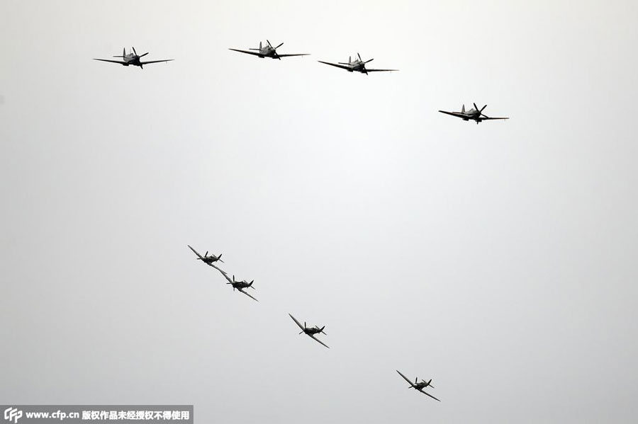 18 spitfires and 6 Hawker Hurricanes perform air show in southeastern England to commemorate the 75th anniversary of the Battle of Britain on Aug. 18, 2015. (Photo/CFP)
