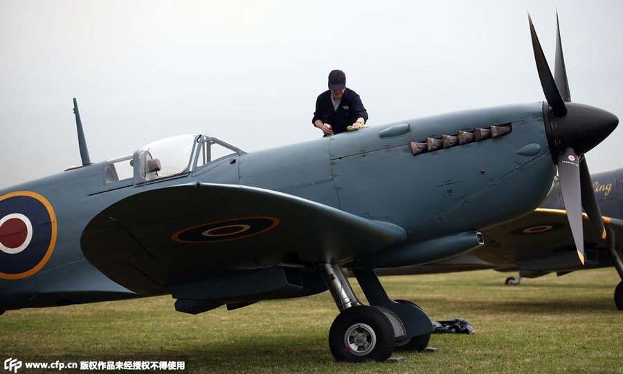 18 spitfires and 6 Hawker Hurricanes perform air show in southeastern England to commemorate the 75th anniversary of the Battle of Britain on Aug. 18, 2015. (Photo/CFP)