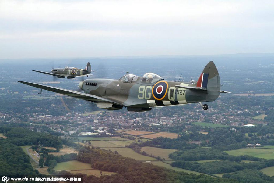 18 spitfires and 6 Hawker Hurricanes perform air show in southeastern England to commemorate the 75th anniversary of the Battle of Britain on Aug. 18, 2015. (Photo/CFP)