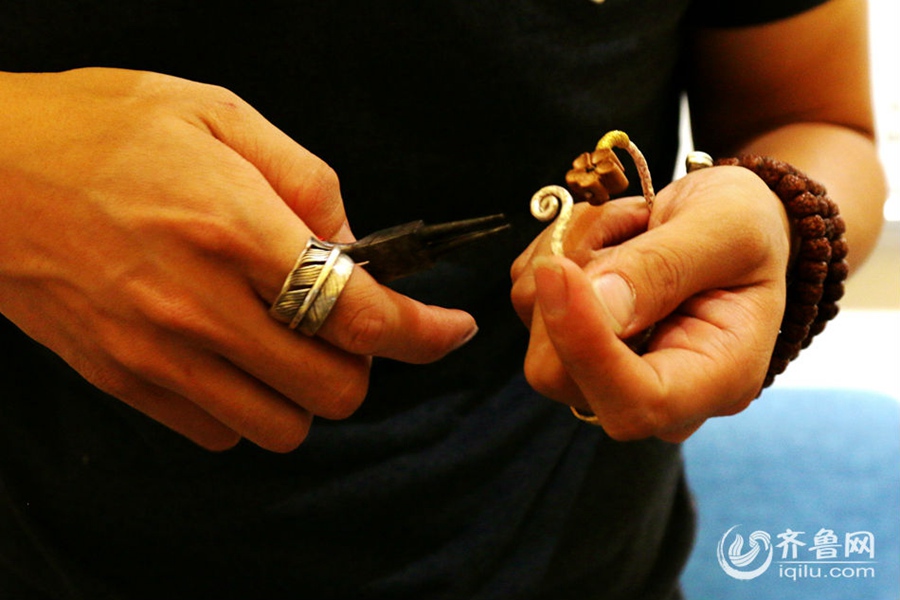 Liu Yusheng and his hand-made silver jewelries. (Iqilu.com/Bai Shaoguang)