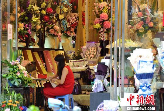 The owner of a flower shop is busy making bouquets sold on the Qixi Festival on Aug. 18, 2015 in Fuzhou, Fujian province. (Photo by China News Agency/ Zhang Bin)