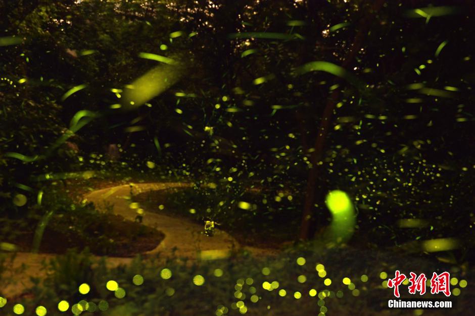 To celebrate the “Chinese Valentine”, a firefly-themed party is held in Nanhu Amusement Park in Guangzhou, south China’s Guangdong province on Aug. 18, 2015. Thousands of fireflies created a romantic atmosphere at night, which attracted many visitors. (CNS/Zhong Yanming) |