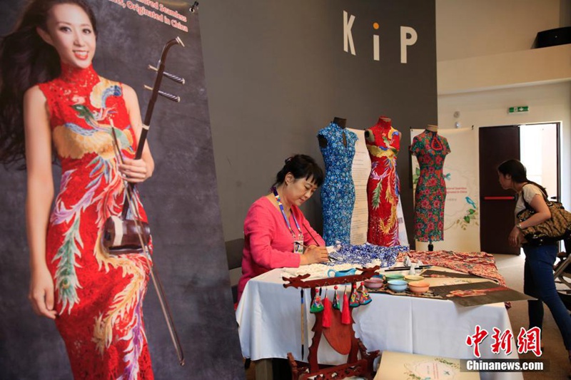 Chinese arts exhibition "Silk Road Zen" opens in Silk Road Museum of the Milan Expo on Aug. 19, 2015. Cheongsams, Chinese traditional women dress, made of seamless lace attracted much attention from visitors. (CNS/ Zhao Juan)