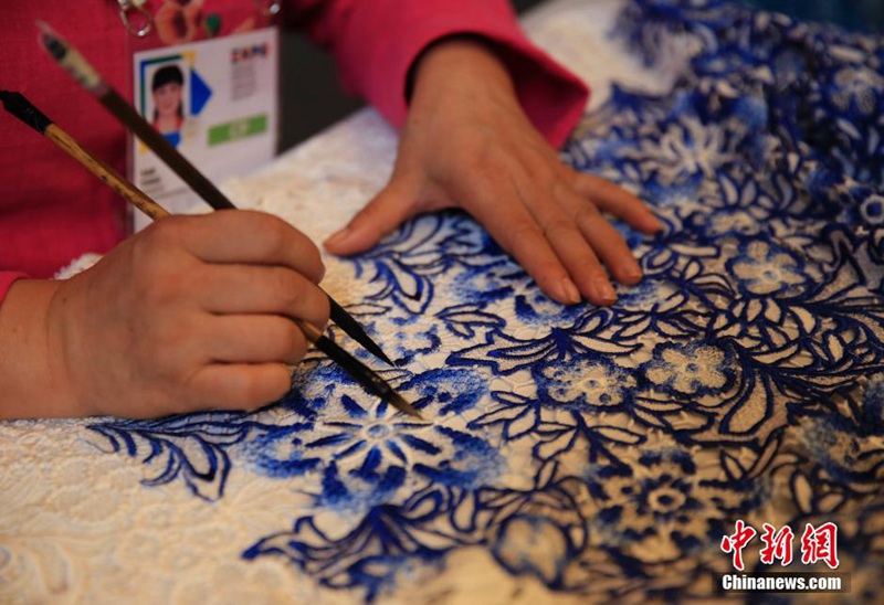 Chinese arts exhibition "Silk Road Zen" opens in Silk Road Museum of the Milan Expo on Aug. 19, 2015. Cheongsams, Chinese traditional women dress, made of seamless lace attracted much attention from visitors. (CNS/ Zhao Juan)