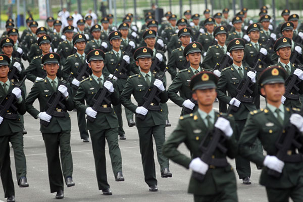 A procession of female soldiers practice for the Victory Day military parade, Aug 14, 2015. [Photo by Zou Hong/China Daily]