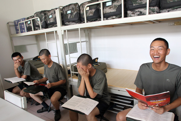 Members of the military choir rehearse in their dormitory. [Photo by Zou Hong/China Daily]